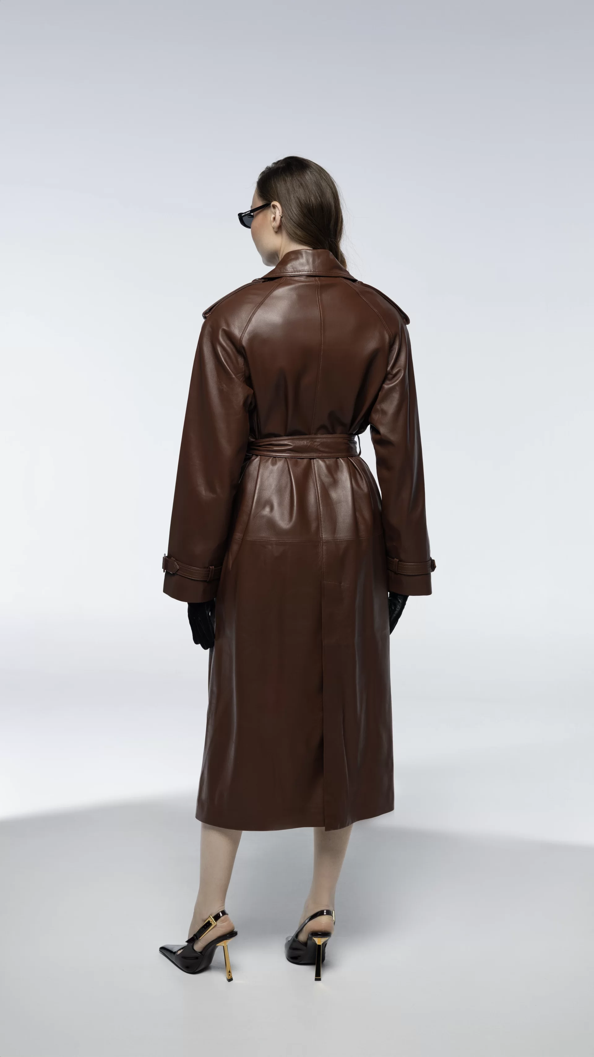 Модель выполнена в классическом тренч-силуэте с чёткой линией плеч и выверенными пропорциями. Натуральная кожа придаёт образу характер и структуру, а лаконичный крой делает тренч универсальным элементом гардероба.